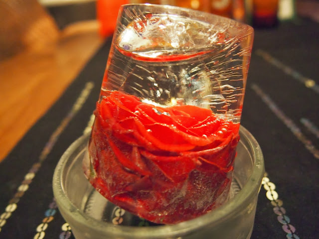 päivän jäätävän kaunis vinkki, jäädytellä ruusut joulupöytään. Laitoin