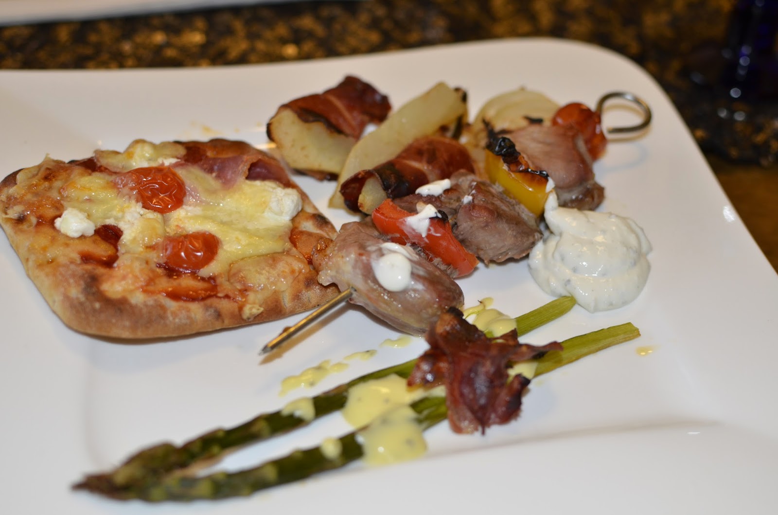 Pääruuaksi vartaita, Pågenin leipään tehty pizza ja parsaa. Herkullista.